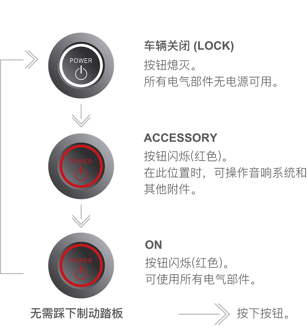 按下POWER按钮同时保持踩住制动踏板。启动电源系统时,切勿长时间按住POWER按钮。
