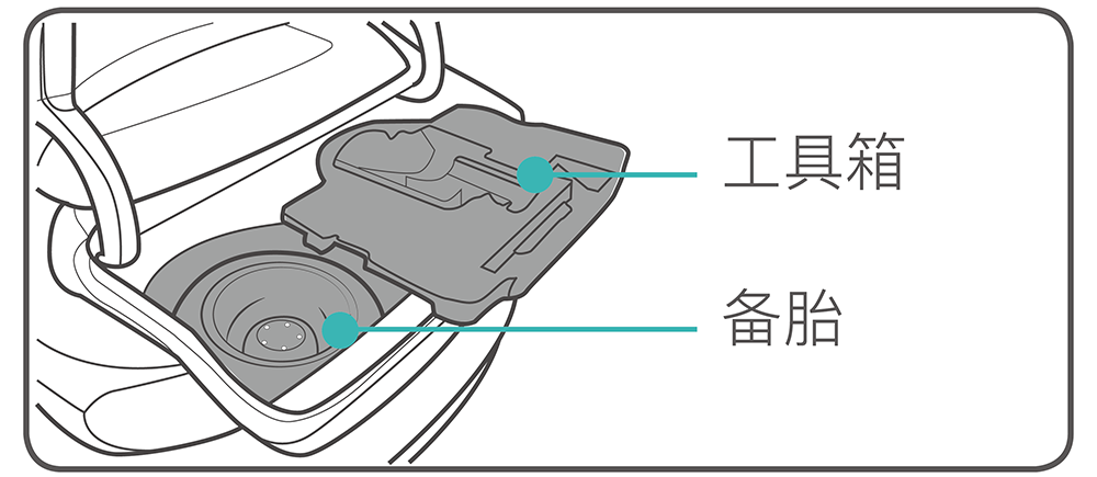 。完成后,收纳工具于原处,将瘪胎面朝下紧固在备胎槽中。