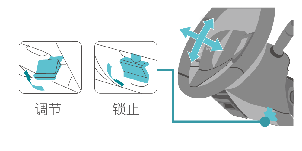 方向盘可通过上移、下移、前推、后拉,进行调节。