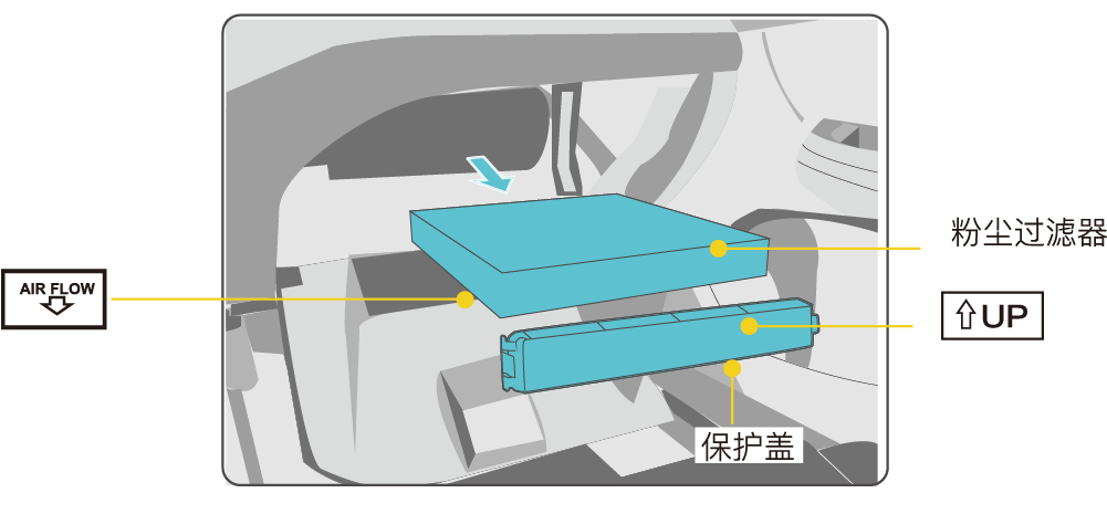 请每年或每2万公里更换粉尘滤清器滤芯,如果车辆多行驶在满是灰尘的环境中,建议缩短更换里程/时间。