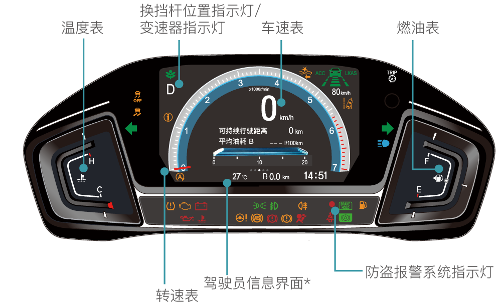 *1:将电源模式设定为ON时,这些指示灯点亮表示正在进行系统检查。数秒后或发动机起动后,这些指示灯将熄灭。如果某一指示灯不点亮或不熄灭,相应的系统可能有故障。若要解决问题,请遵循用户手册中的指示。