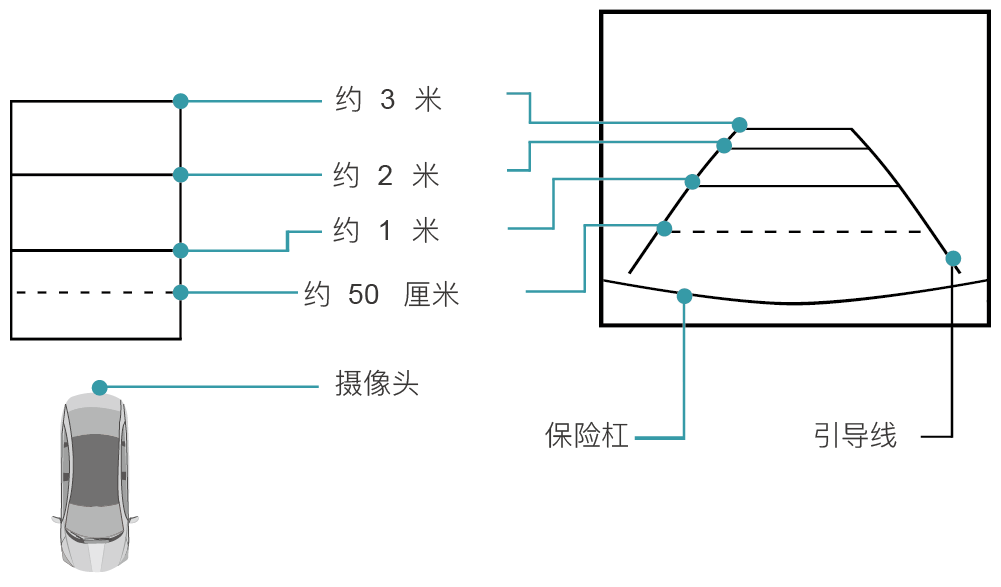 档时,显示屏自动切换为后视图像。摄像头位置和图像
