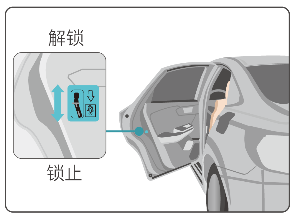 无论车内门锁处于打开还是关闭状态,儿童门锁都可防止从车内打开后车门。