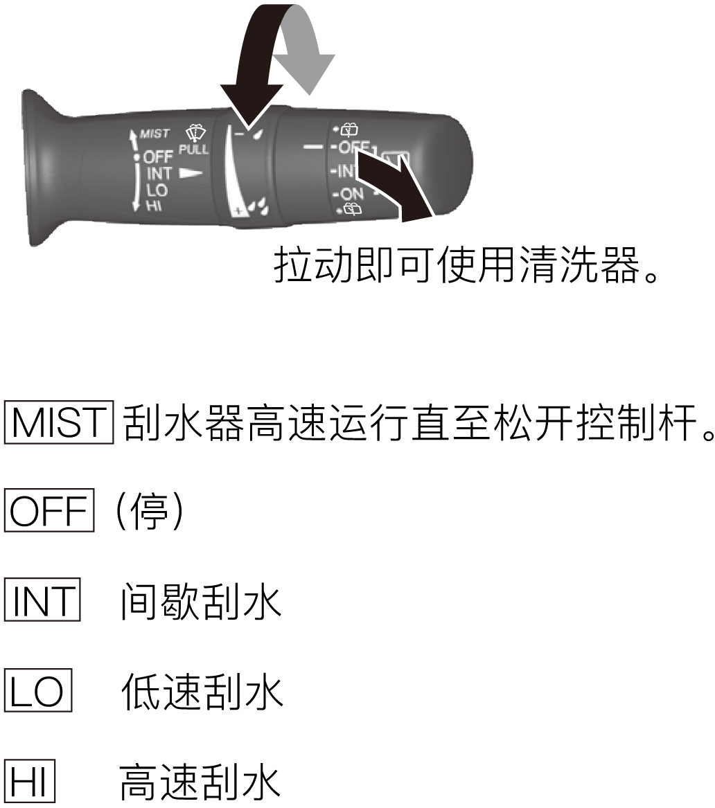 根据驾驶环境和挡风玻璃的清洁程度,使用清洗器和刮水器以保证视野清晰。