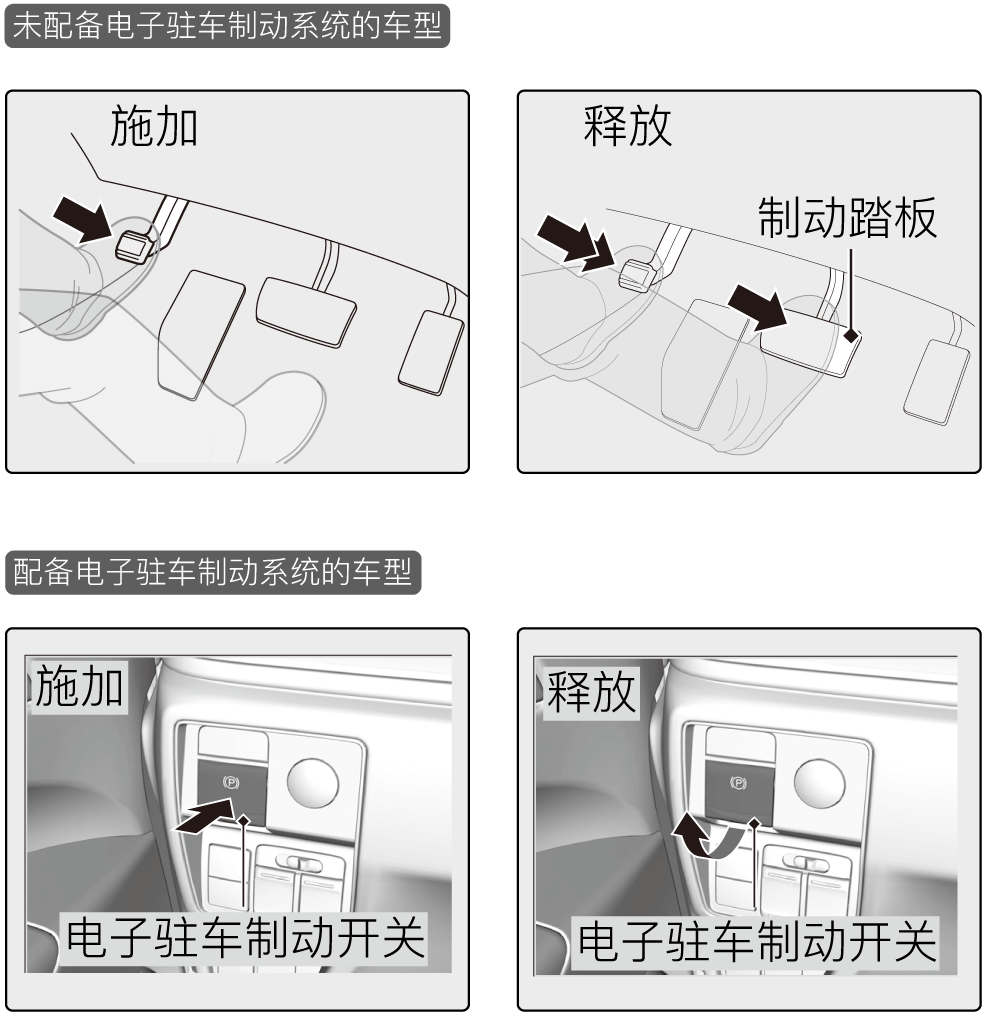 停车后,使用驻车制动使车辆保持停止。施加驻车制动后,可手动或自动释放。