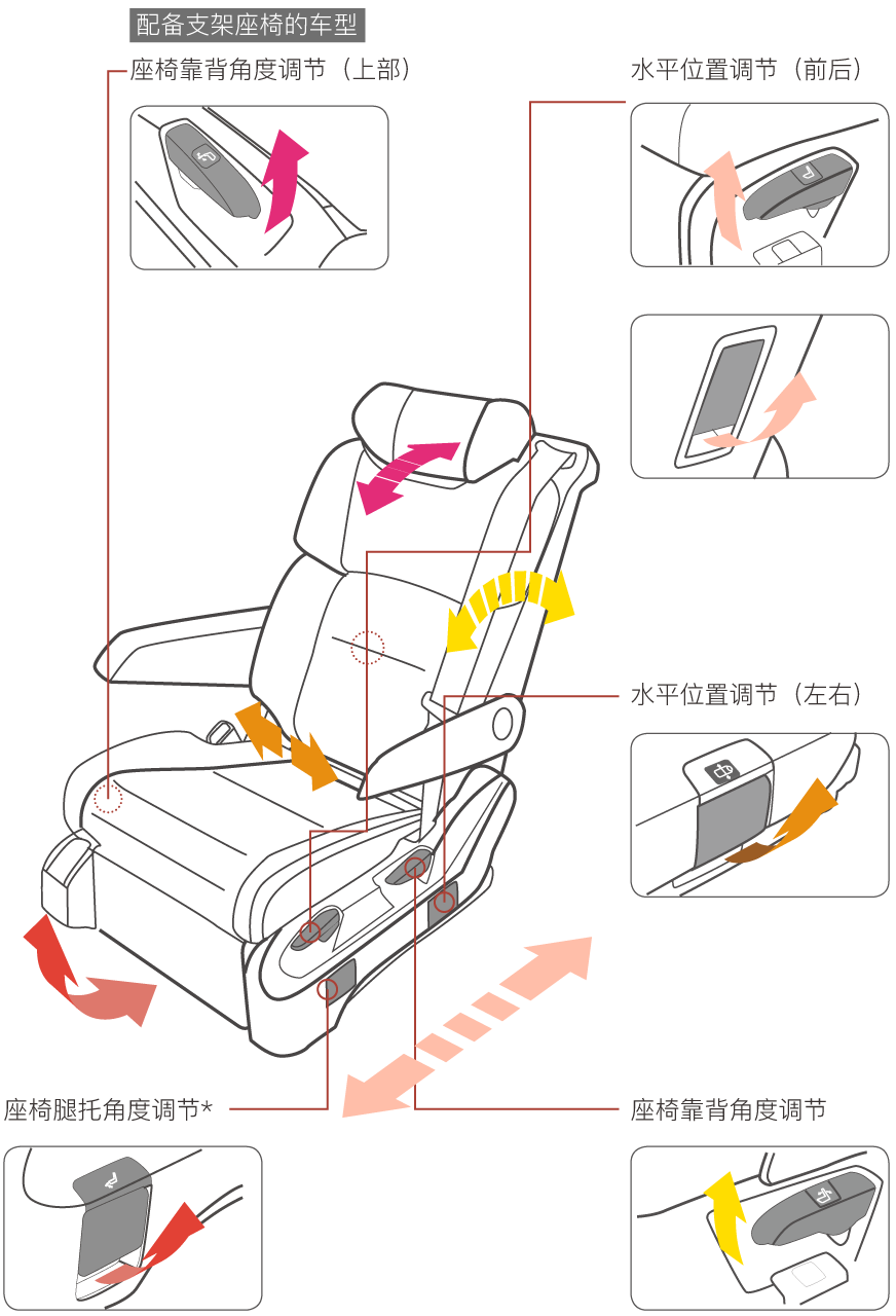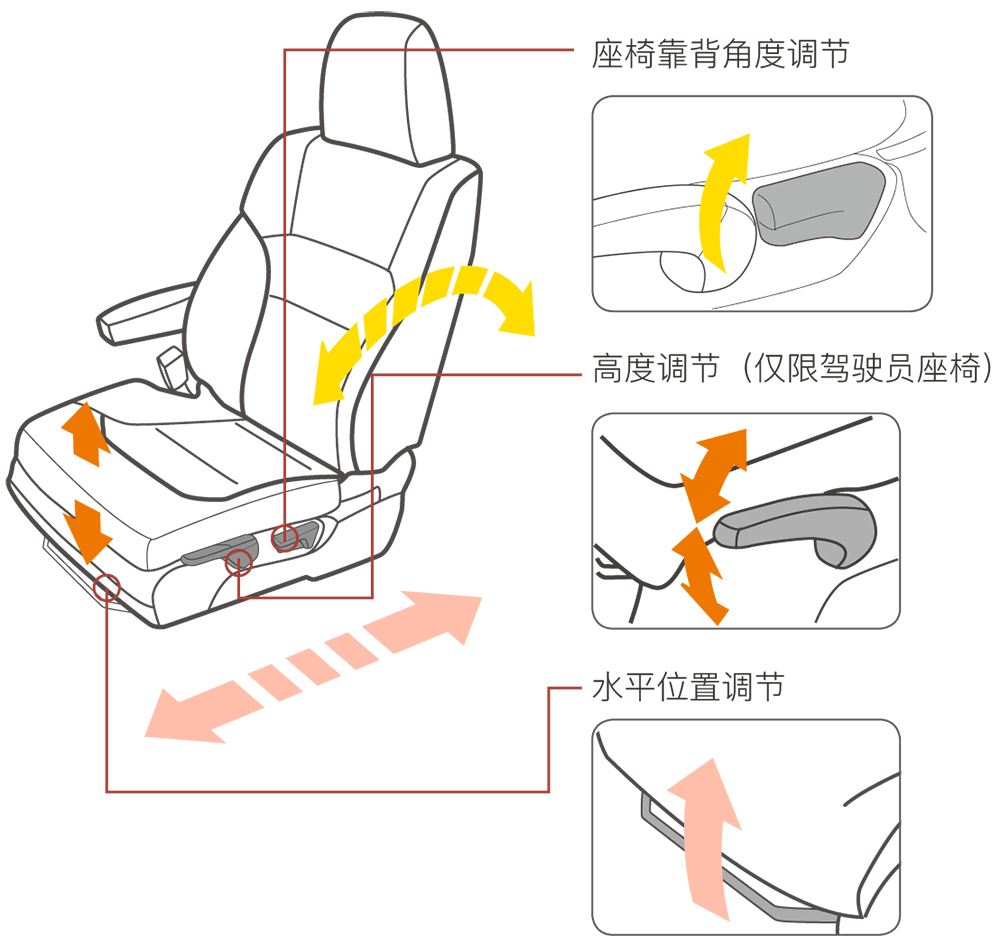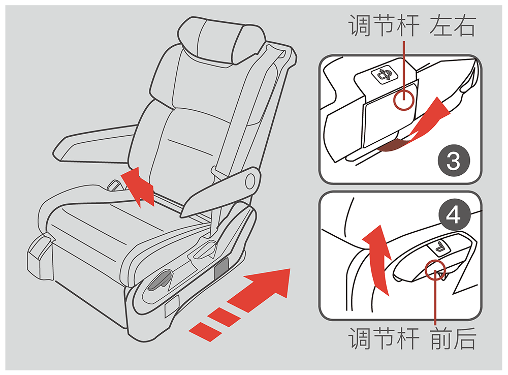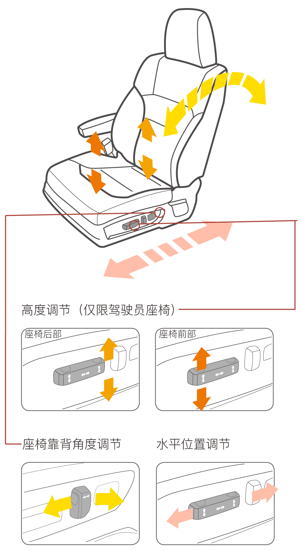 向上拉水平位置调节杆(前后),然后向后滑动座椅。驾驶前确保座椅牢固锁止。