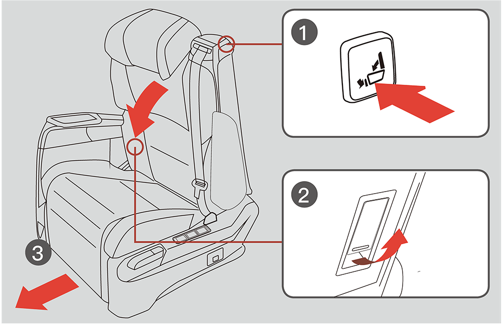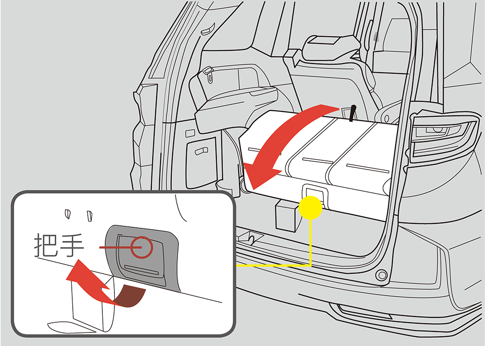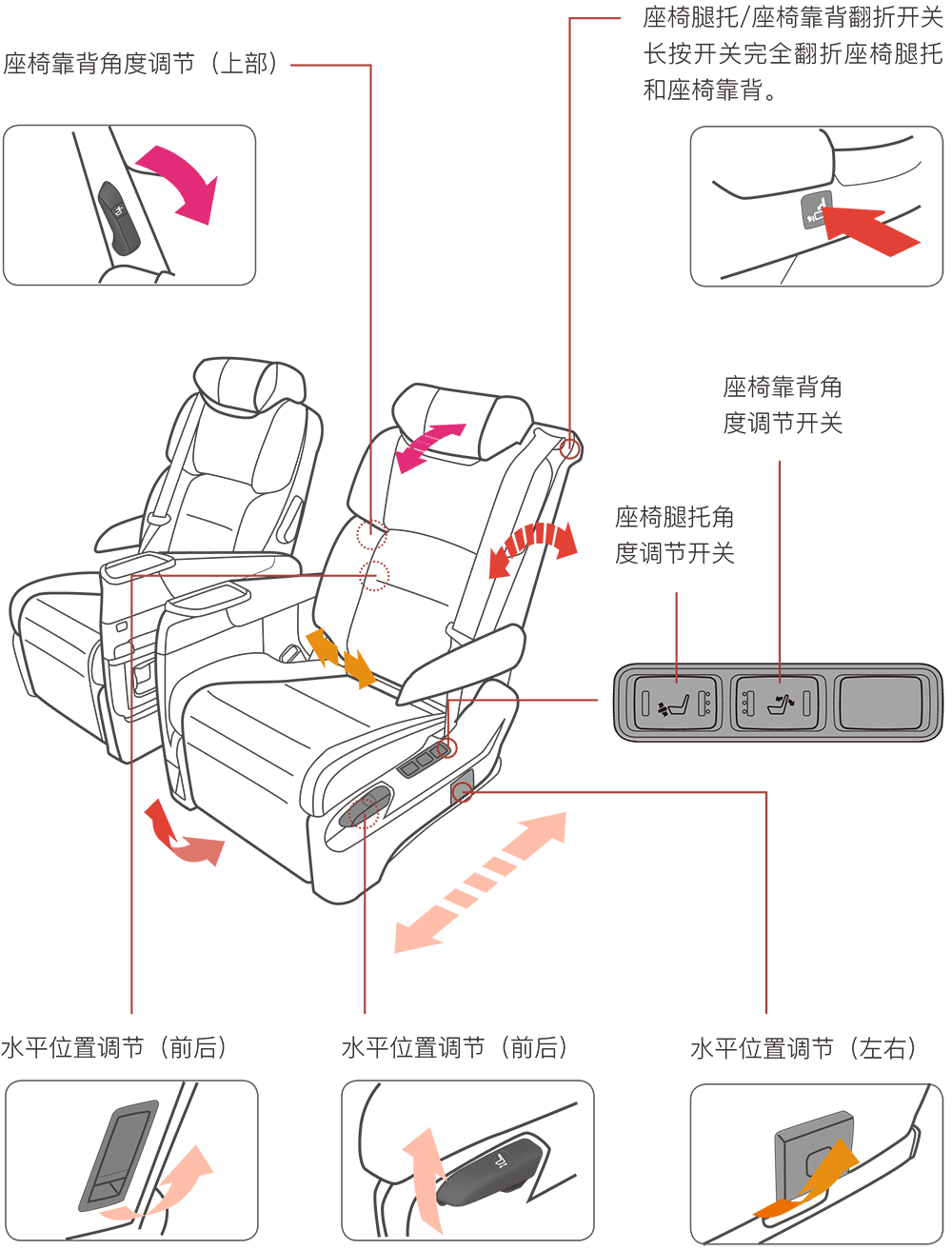 长按座椅背面的座椅腿托/座椅靠背翻折开关,向前倾斜座椅靠背。座椅腿托也收纳到其原始位置。