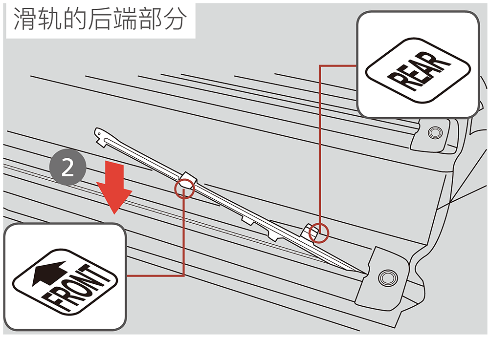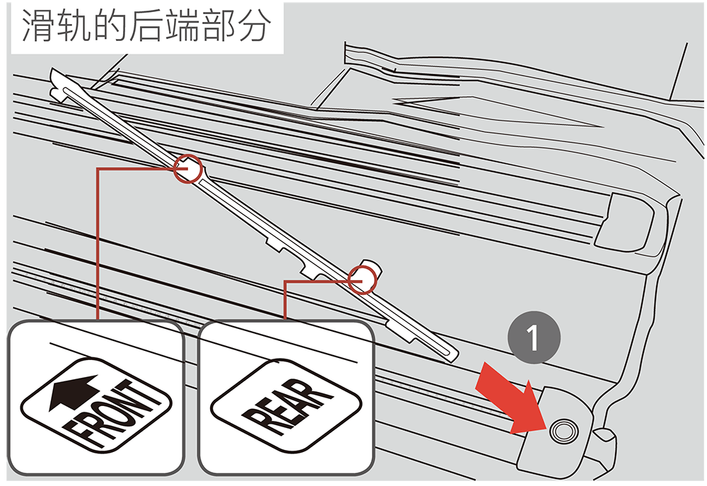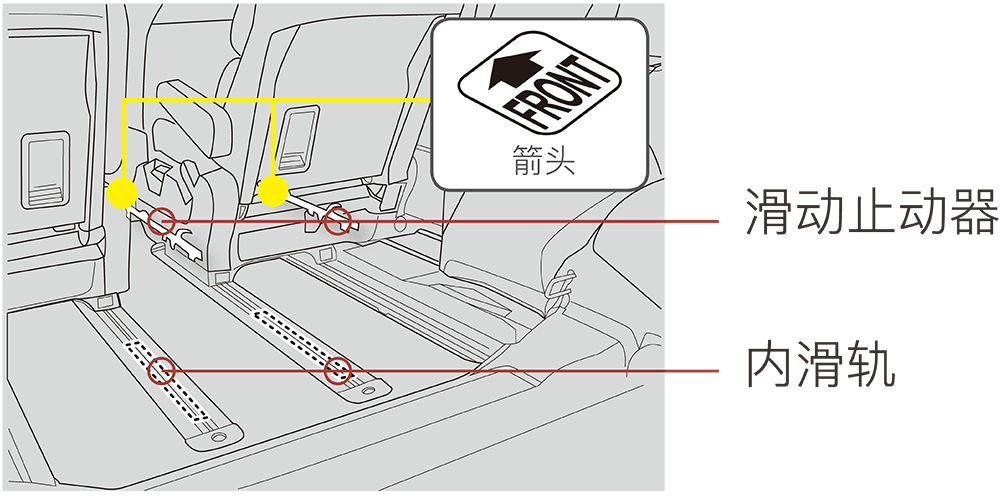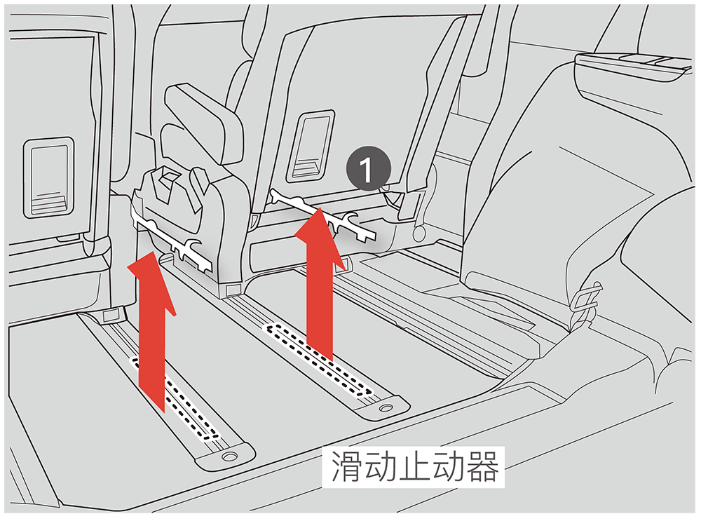 为避免调节第二排座椅时碰到后排乘客腿部,可安装滑动止动器。箭头朝向车辆前部,按照以下步骤将滑动止动器安装到第二排座椅的内滑轨上。