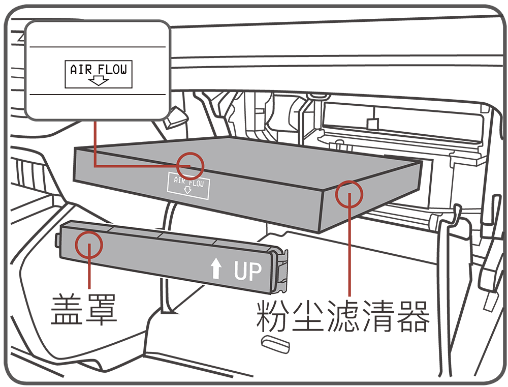 请每年或每2万公里更换粉尘滤清器滤芯,如果车辆多行驶在满是灰尘的环境中,建议缩短更换里程/时间。