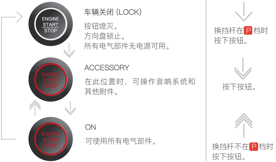 3. 按下 ENGINE START/STOP 按钮,无需踩下加速踏板。