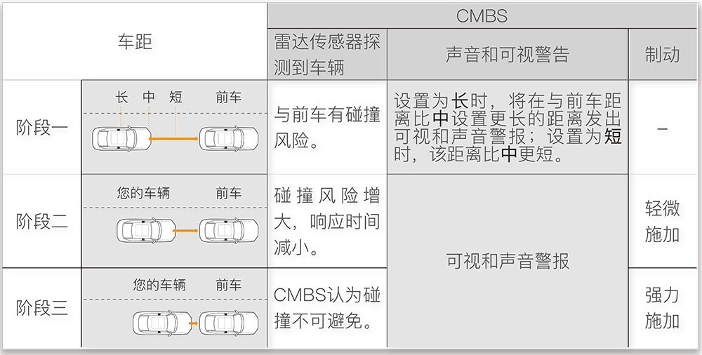 系统对于可能发生的碰撞有三个警报阶段。但是,这取决于环境条件,CMBS系统 可以跳过所有阶段直接触发最后的阶段。
