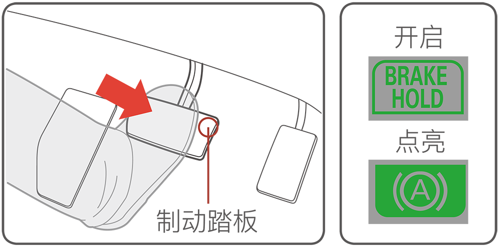- 自动制动保持指示灯点亮后,松开制动踏板。